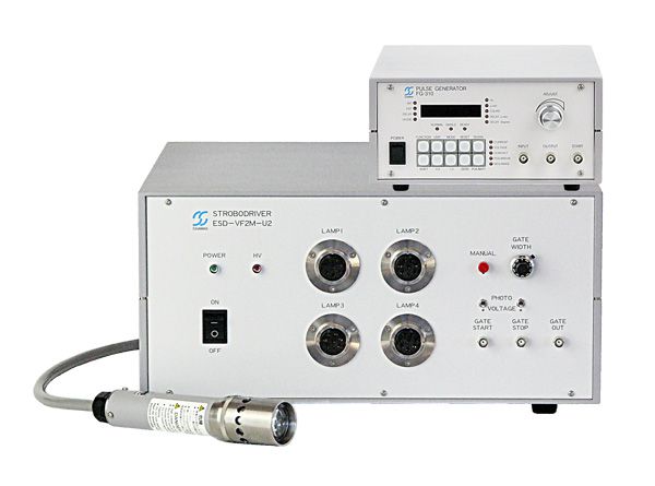 ストロボスコープ ESD-VF2M-U2 は、超高速コマ撮りに追従するため、撮影されるコマごとにフラッシュがたかれるのではなく、比較的長い閃光持続時間(50 μsec~2 msec)内に高速コマ撮りする、きわめてユニークな方式の照明装置です。照明システムは、ドライブユニットESD-VF2M-U2とランプハウスSLA-153-U1により構成され、さらに撮影対象が繰り返し現象の場合、パルスジェネレータ FG-310 を併用することで、撮影したいタイミングを直接眼で確かめながら容易に設定することができます。
